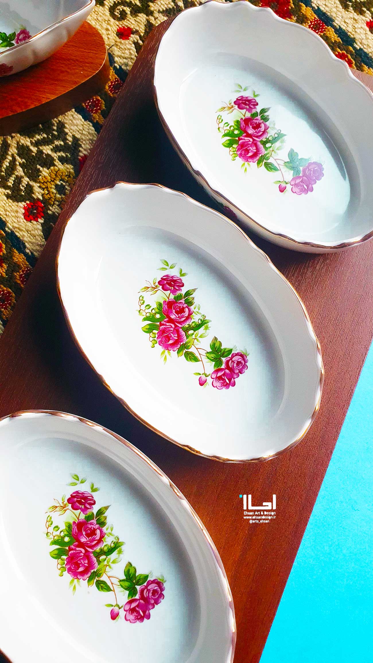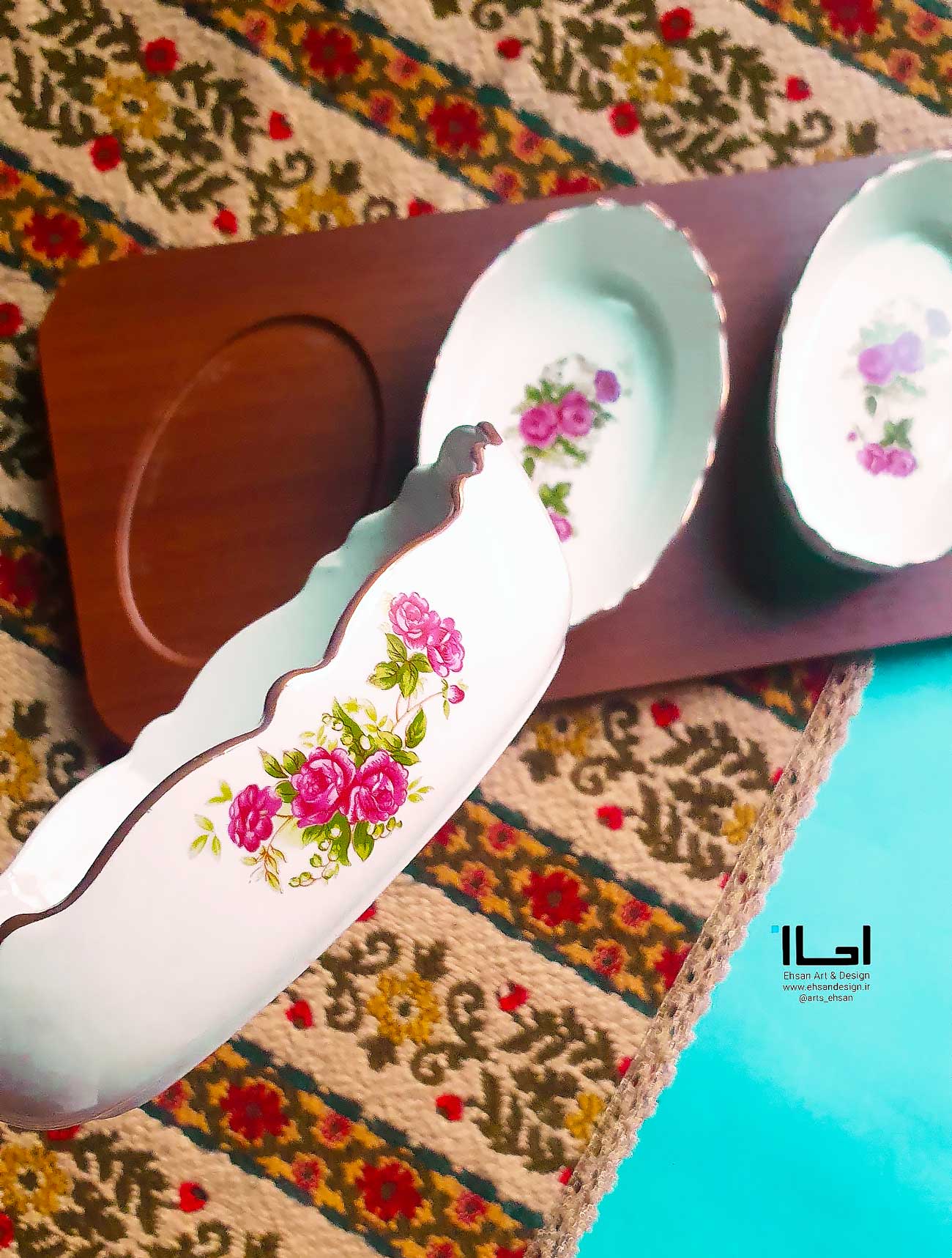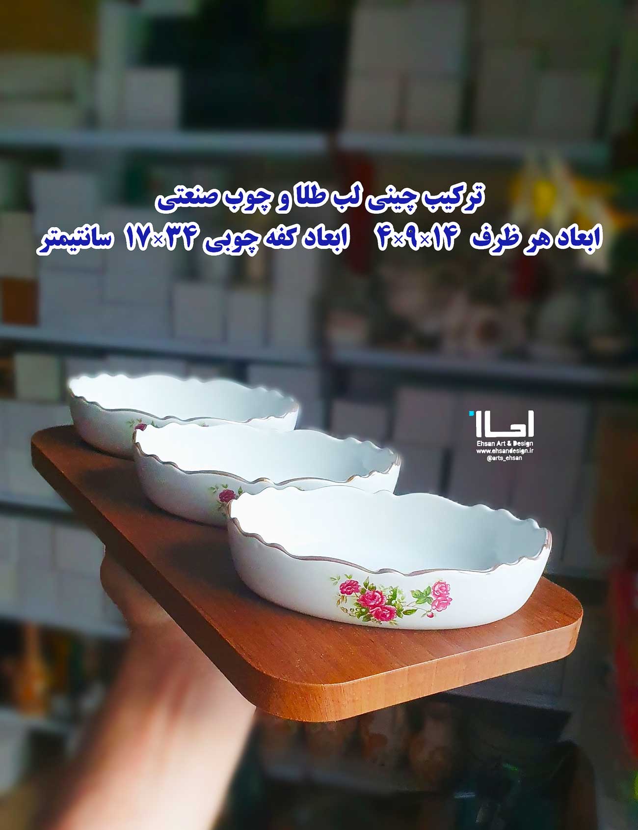 این سرویس پذیرایی ترکیب چوب و چینی لب طلایی،شامل یک صفحه چوبی قابل شستشو و ۳ ظرف از جنس چینی با طرح گل سرخی و لب طلایی با کیفیت همراه با بسته بندی کادویی است.