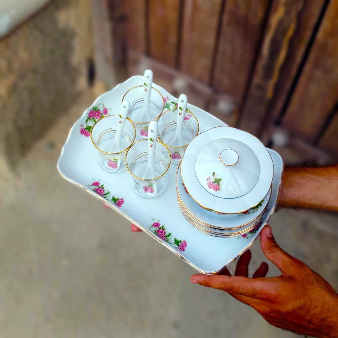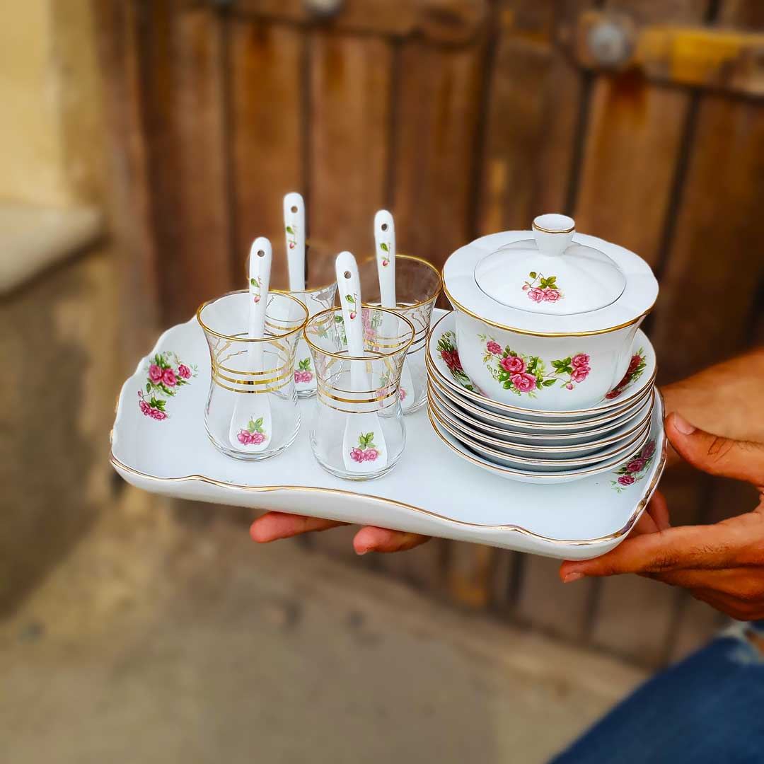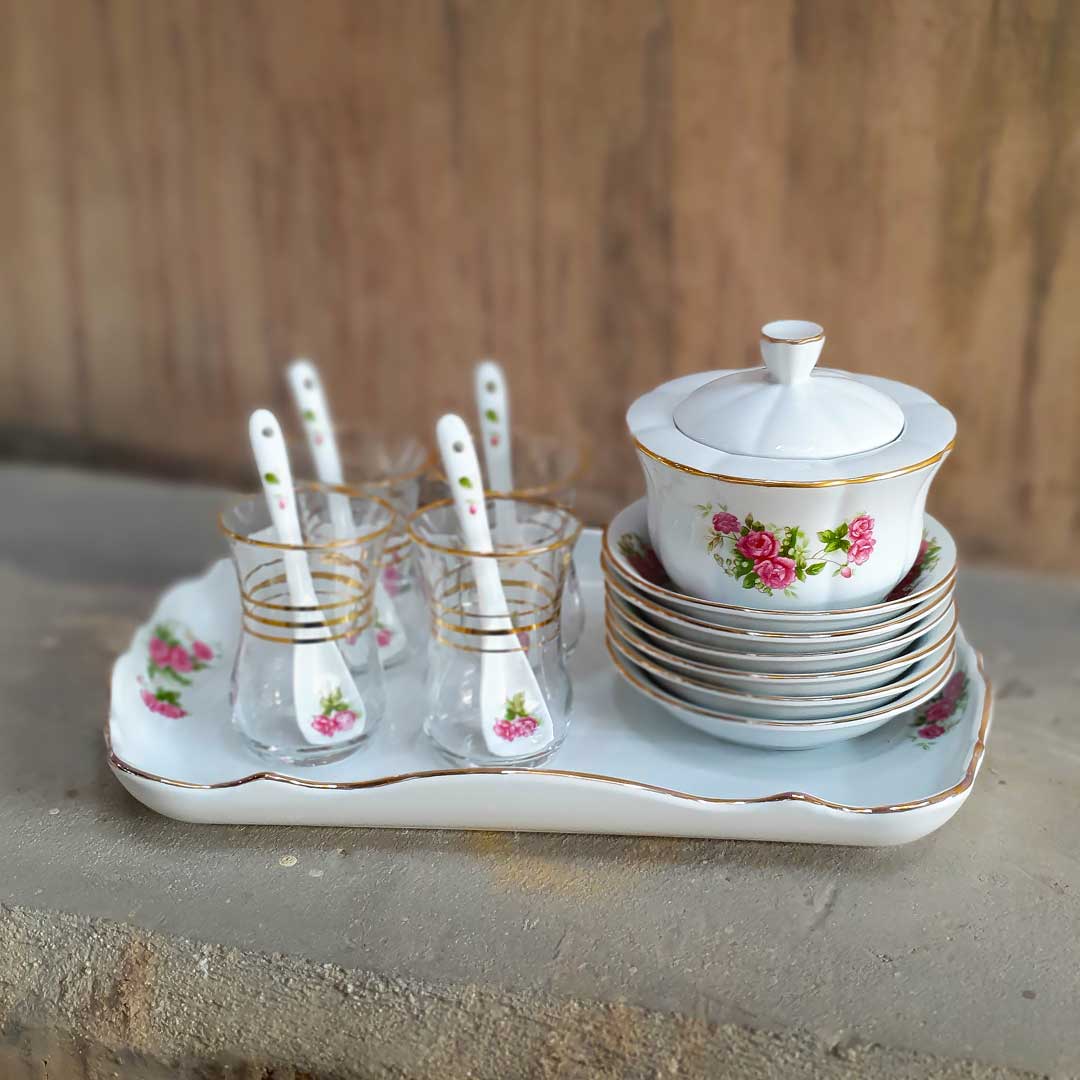سرویس چایخوری گل سرخی مه لقا یکی از زیباترین و خاص‌ترین سرویس های چایخوری گلسرخیه. این سرویس می تونه به عنوان ظروف پذیرایی از مهمون هاتون استفاده بشه.ضمن اینکه به قدری لوکس و باکیفیته که می تونید به عزیزترین کسانتون هدیه بدید.